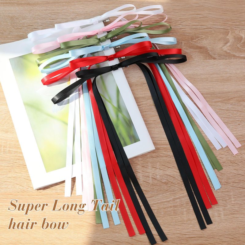 6pcs Hair Bow Clips for Women, Long Tail Tassel Bowknot Hair Ribbons Barrettes for Girls, Solid Silky Satin Ponytail Holder Hair Accessories