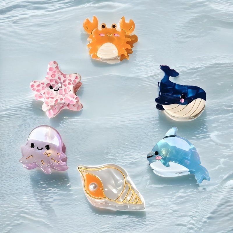 6 PCS Small Hair Claw Clips Sea Animals Series Include:whales, lobsters, starfish, octopuses, sea shells, and dolphins Size: as the picture Material:Cellulose Acetate