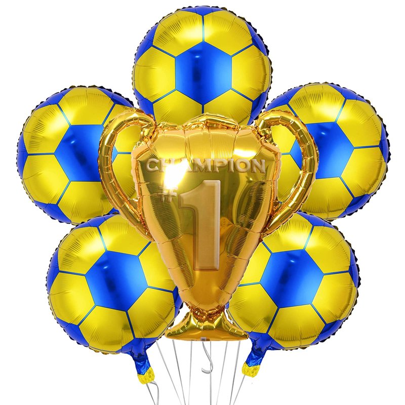 6Pcs Soccer Party Balloons Set, Championship Trophy Balloon and Yellow Blue Soccer Foil Balloons for Birthday Baby Shower Wedding Anniversary Soccer Themed Party Decoration Supplie
