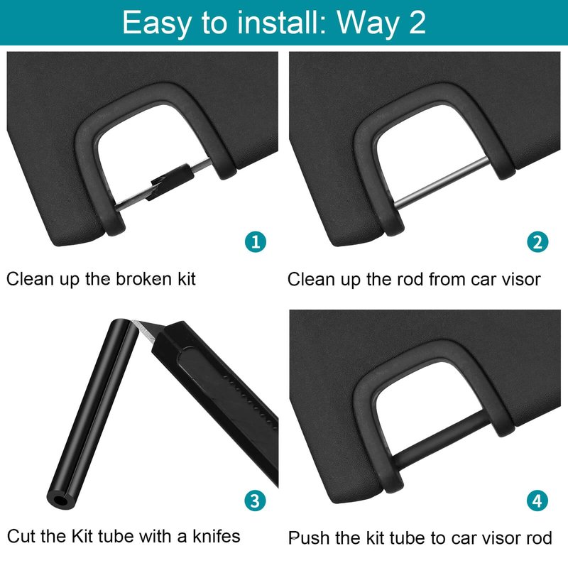 Easy to install way 1: Clean up the Broken Kit , Remove the Rod From The Car Visor, Put the Rod Into The Repair Kit,Put the Rod with Kit Back to Visor.