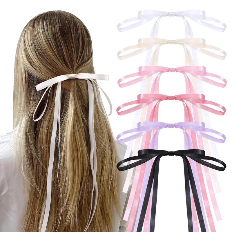6pcs TOKUFAGU Hair Bow Clips for Women, Long Tail Tassel Bowknot Hair Ribbons Barrettes for Girls, Solid Silky Satin Ponytail Holder Hair Accessories