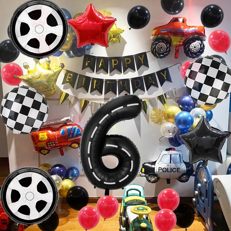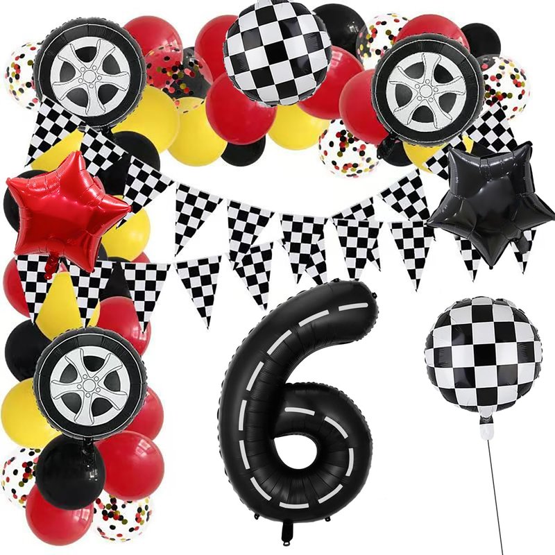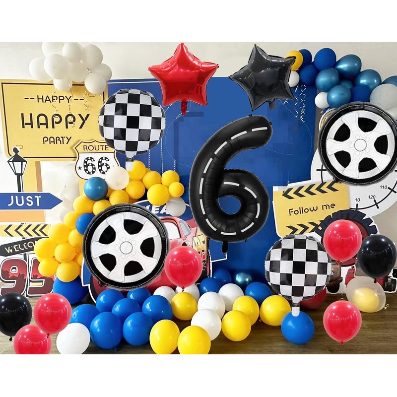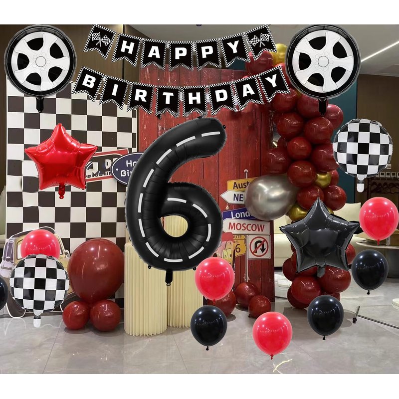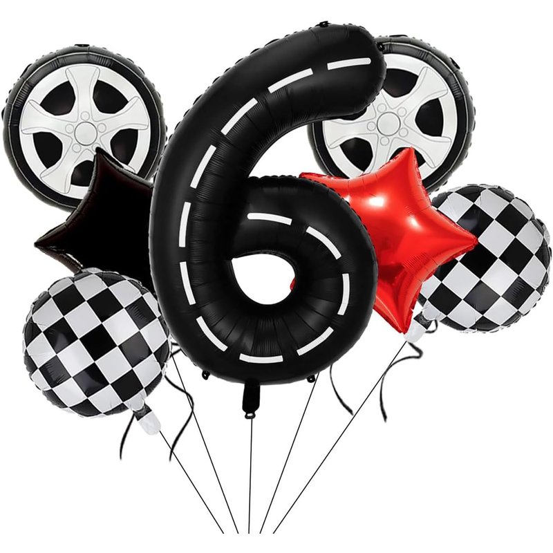 - BIRTHDAY PARTY DECORATION: Racing Car Theme Kids Birthday Decoration Balloon Set Includes 1 pcs 40-inch black race car number 6 balloon, 2 pcs 18-inch black and white checkered balloons, 2 pcs 18-inch tyre balloons, 1 pcs 18-inch black star balloon, 1 18-inch red star balloon, 1 pcs roll of ribbon, 1 pcs straw. Total of 7 pcs large foil balloons.