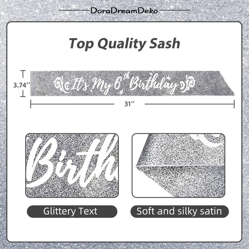 - 6th Birthday Sash: 6th themed birthday sash with the letter "It's my 6th Birthday". Happy 6th birthday sash is made of ribbon with silver background and silver word. 6th birthday tiara and sash set be great 6th birthday supplies for girls, 6th birthday favors, 6th birthday decorations for girls 6 years old. Wearing 6th birthday sash, is sure to make the 6 year old girl the center of attention at 6 year old birthday party and feel like a princess