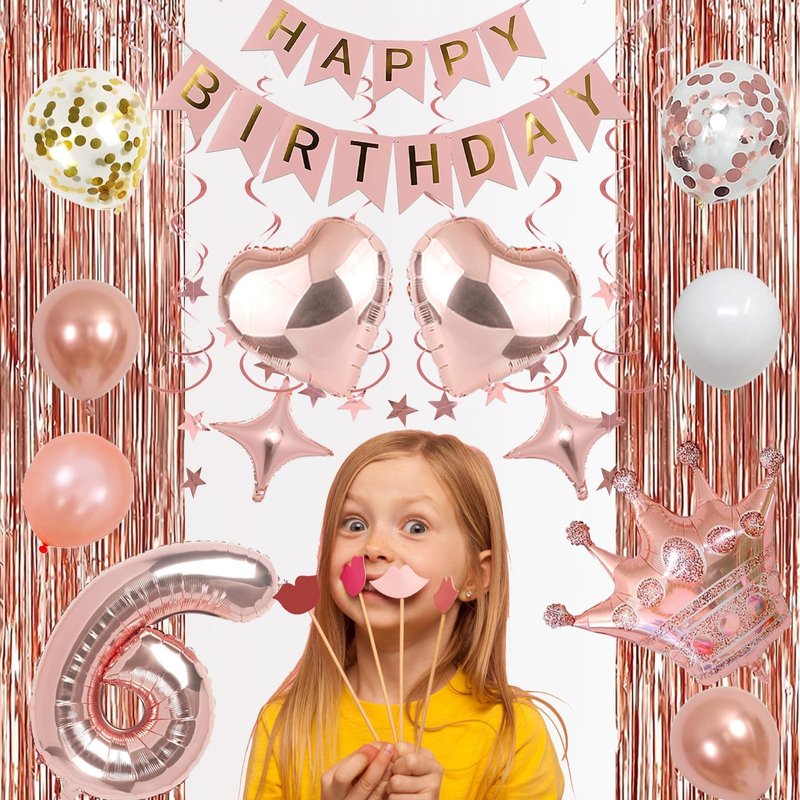 - Best Choice for Girls’ 6th Birthday Party: There are beautiful rose gold balloons for making a balloon arch. Shiny rose gold fringe curtains, happy birthday banner, and stary mirror streamers are perfect supplies for making a decoration wall, more than 15 different rose gold decorative elements will make your birthday party unique.