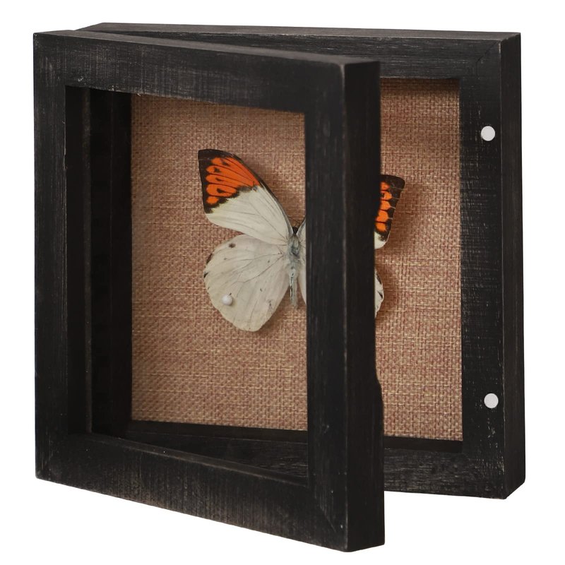 The black shadow box 5x5 inch with exterior depth of 2 inches and interior depth of 1 inches, which was real glass instead of plexiglass, great for creating your own display of keepsakes, collectables, photos and small trinkets and shells, insects and butterfly stuffed to make a very special keepsake to gift or keep. Weathered wood finish gives the little display shadowbox a vintage look, not only a great home decor, hanging on the wall or standing on the tabletop, but also a memory box gift for dog.