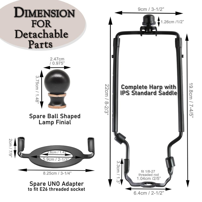 - COMPLETE LAMP HARP SET AND MORE- Detachable Pratical Spare Parts include an adjustable harp,two harp holder(saddle and E26 screw base uno fitter), finial and one spare part of heavy ball screw on top