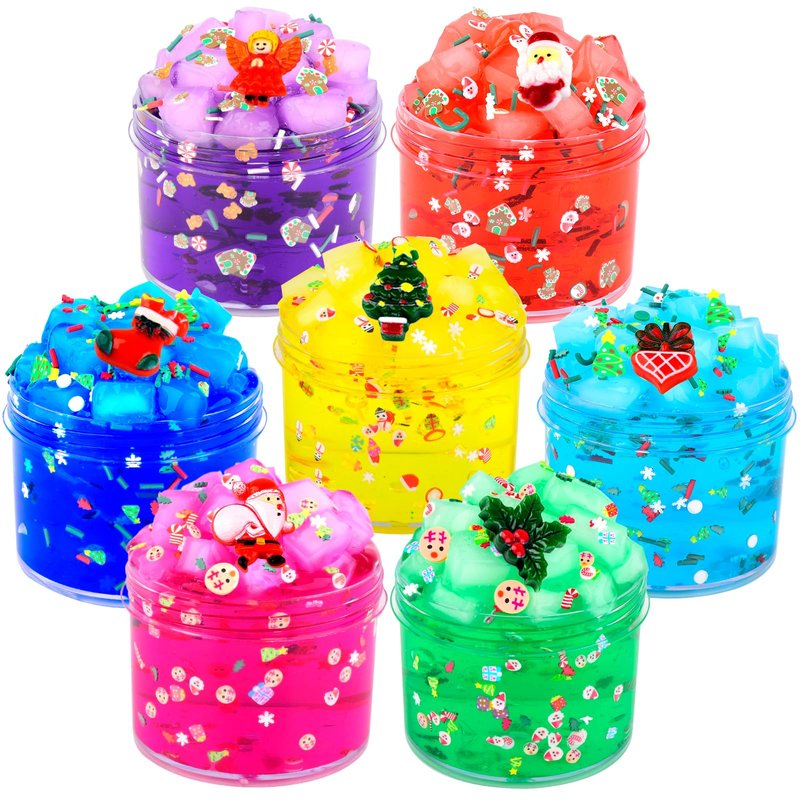 - 7 Pack jelly cube crunchy slime kit with blue, red, yellow, sky blue, magenta, green and purple slime, and christmas stuff charms (60ml*7).