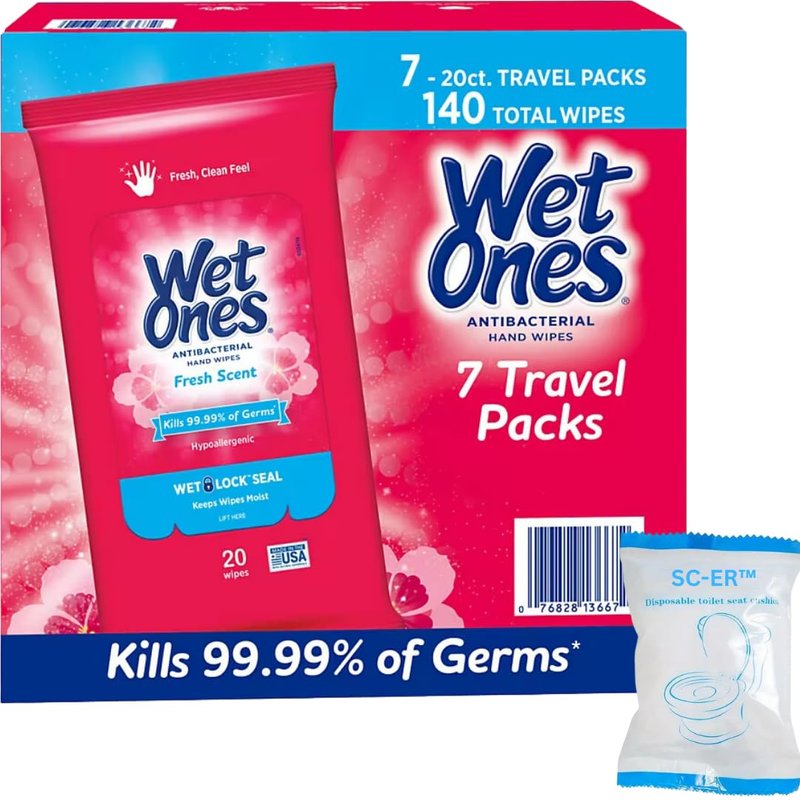7-Pack Wet Ones®' Antibacterial Hand Wipes Travel Packs - Fresh Scent - 20ct EACH PACK (140 Wipes) - BONUS: 1pk Disposable & Portable Travel Toilet Seat Cover!