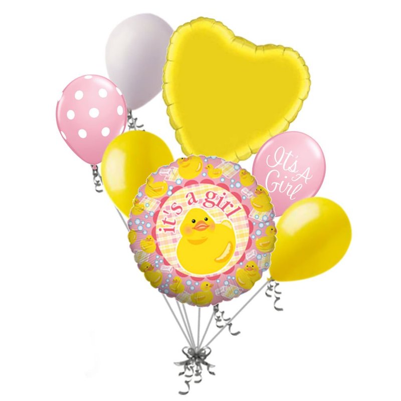 1 – 18” “It's a Girl” Duck Round Balloon 1 – 18” Yellow Heart Balloon 5 - 12" Mixed Latex Balloons (1 White, 1 White Polka Dots on Pink, 2 Yellow, 1 White "It's a Girl" Print on Pink) These items may arrive flat or in retail packaging All balloons sold online are shipped out with no air/helium. Filled balloons don't travel well through different elevations. All balloons are sold without ribbons.