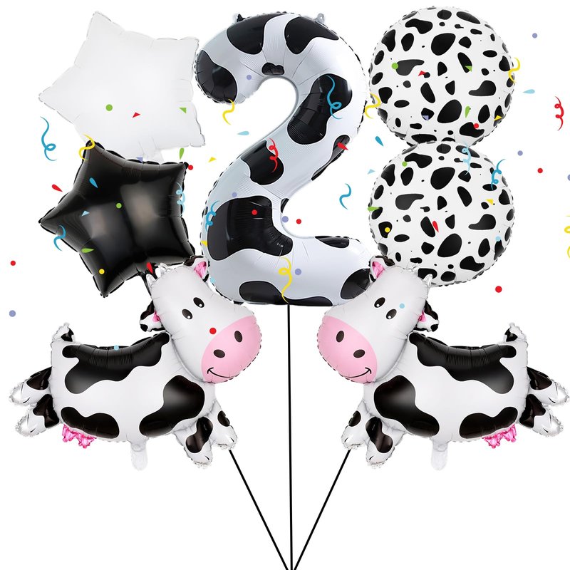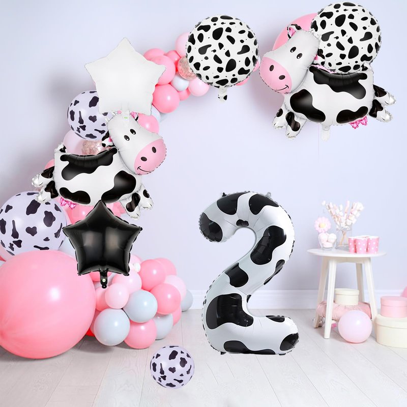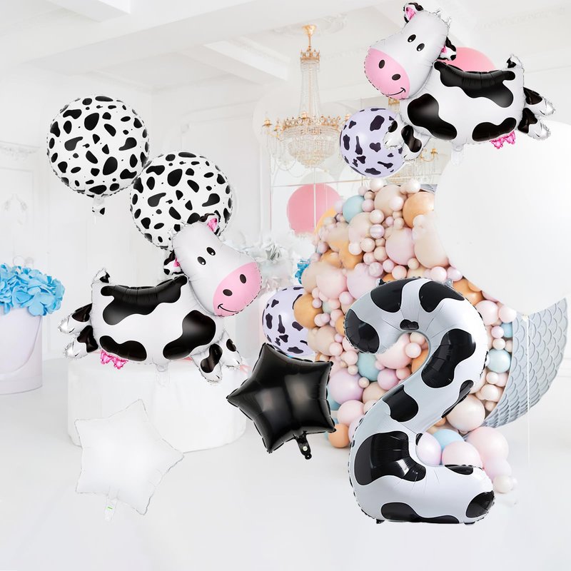 - Package:2pcs Cow foil balloon, 1pcs cow color number balloon, 1pcs 18'' white star balloon, 1pc 18'' black star balloon,2pc 18 inch dot balloons for cows.