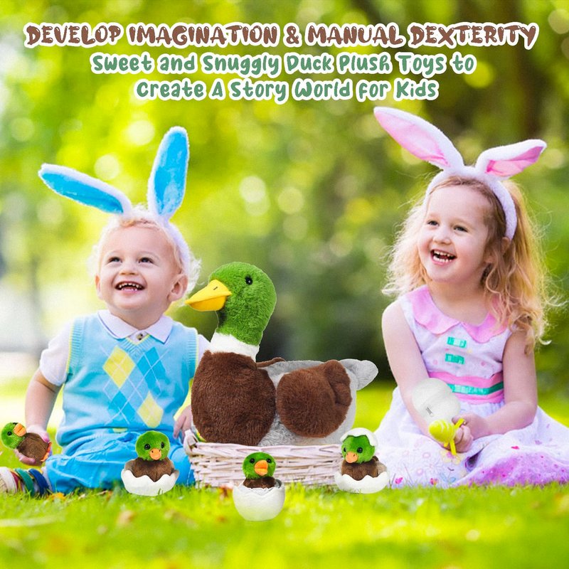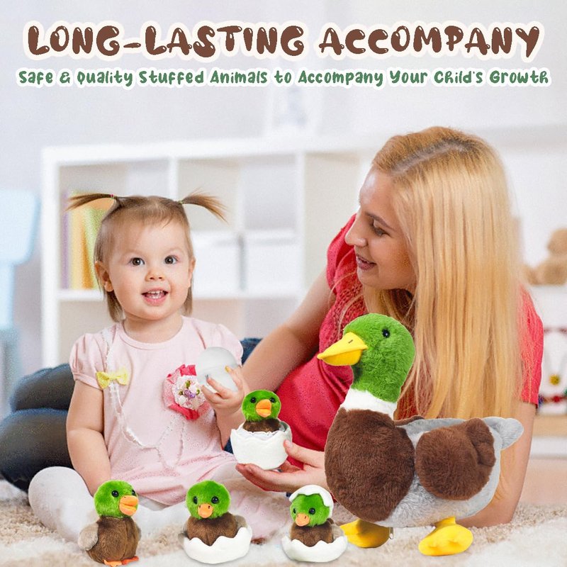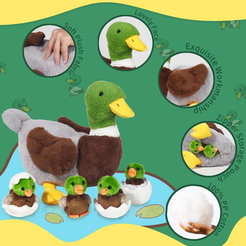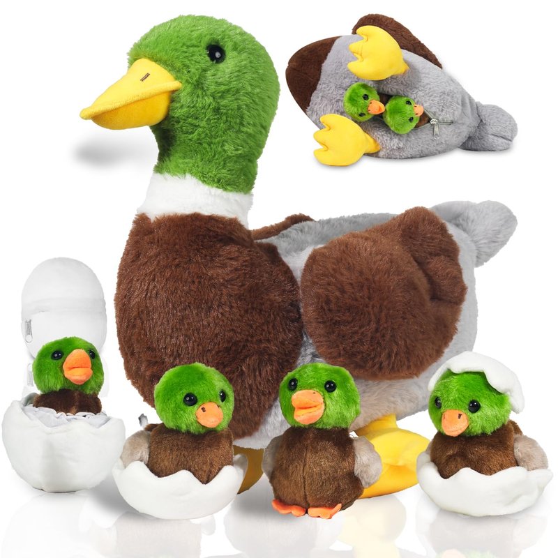 - 【🎇Interesting and Unique Design】This duck stuffed animal is designed like a realistic duck, colorful and detailed. The mommy duck comes with a zipper design, so you can store the 4 duck babies and eggs in her belly and open it to feel the hatching process of little ducklings. This is a good toy for kids to learn about small animals and can stimulate their curiosity and imagination. You can put them in your bedroom, living room and make it a perfect decoration for your house.