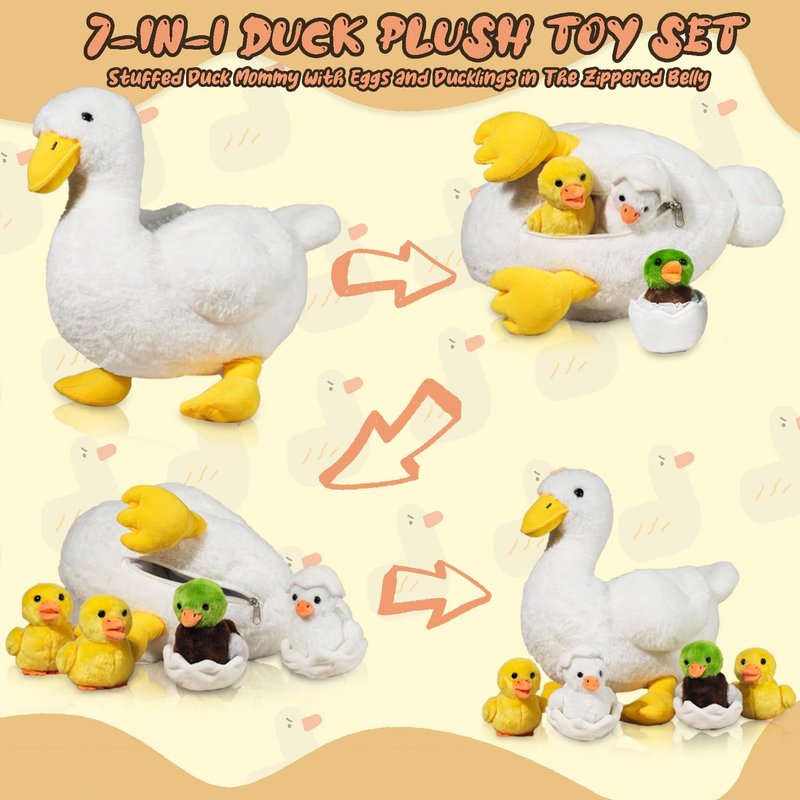 - 【✨7-in-1 Funny Duck Plush】You will get a big duck family, this stuffed duck set total 7 pcs plushies, including 1 big mommy white duck, 4 baby ducklings plush, 1 zippered eggshell and 1 half eggshell. Vivid appearance and cuddly design will surprise everyone who like animals