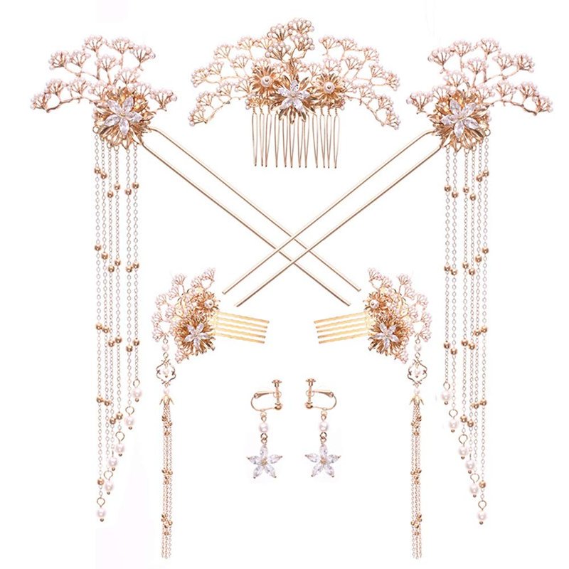 7 PCS Hair Sticks Vintage Hair Pins Bridal Pearl Hair Stick Headpiece Set with Earrings Tassel Hairpin Hair Comb Suit Xiuhe Headdress Headpiece Hanfu Accessories Chinese Style