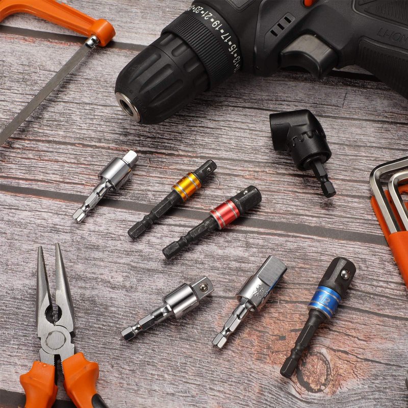 - What you will get: there are a total of 7 pieces of impact grade driver sockets adapter extension kit, including 1 piece 105° right angle drill driver, 3 pieces of hex shank power drill socket adapters including 1/4 inch, 3/8 inch and 1/2 inch, and 3 pieces of square nut hex shank driver drill bits including 1/4 inch, 3/8 inch and 1/2 inch, you can choose the appropriate size of tool to use