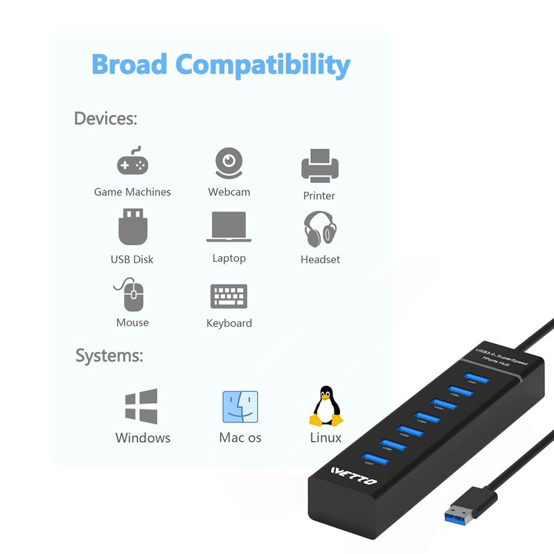 - Wide Compatibility: Compatible with Windows XP/Vista/7/ 8/10, Mac OS X and Higher, Linux, Unix.(The USB 3.0 hub reverse compatible with USB 2.0/USB 1.1)