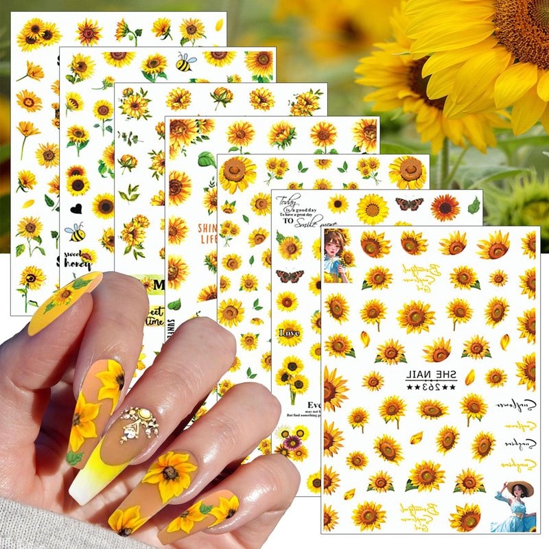 - Package Contain: You will get 7 sheets 3D self-adhesive spring/summer nail decals, designed with beautiful sunflower patterns, enough to meet your daily needs for nail art decorations. The variety flower nail stickes let you enjoy spring/summer happy manicure time