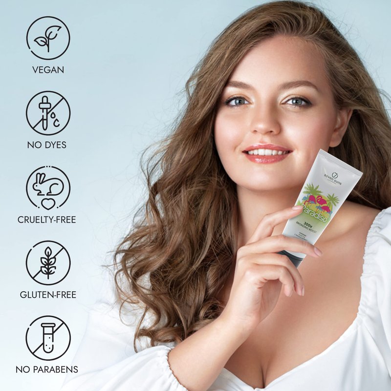 Paradiso tanning lotion bronzer boost is a tropical journey to the land of paradisiacal deep tan. The strong effect of delayed bronzers guarantees intensive effects which last for up to a dozen or so days. The alabaster color of the lotion leaves your clothes spotless, while the tan is even and brown. It is best to apply the cosmetic right before a tanning session. However, you will have to wait a little longer for the final effect of the deep brown color. Features: - Strongly nourishing white bronzer cream - MelanoBlend Formula for higher intensity results - Natural ingredient with a self-tanning effect, creating a natural tan - Paraben-Free, Gluten-Free, No Animal Testing