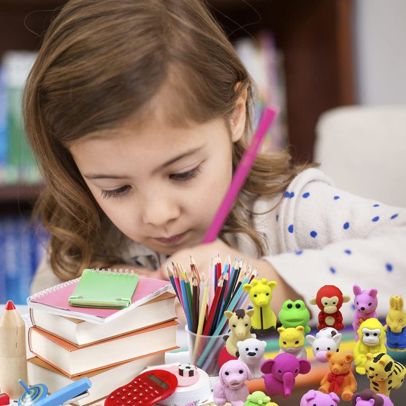 - 🐶 Super Cute: 70 Pack animal erasers desk pet. Every desk pet eraser is unique and individually wrapped, which also makes these great party favors.