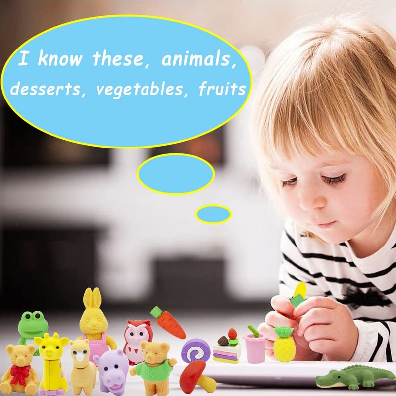 - 🐸Great and fun gifts:Great and fun gifts:Party favors supplies or school prizes! 70 different puzzle erasers gives your kids a chance to increase their imaginations and know different animals food name.