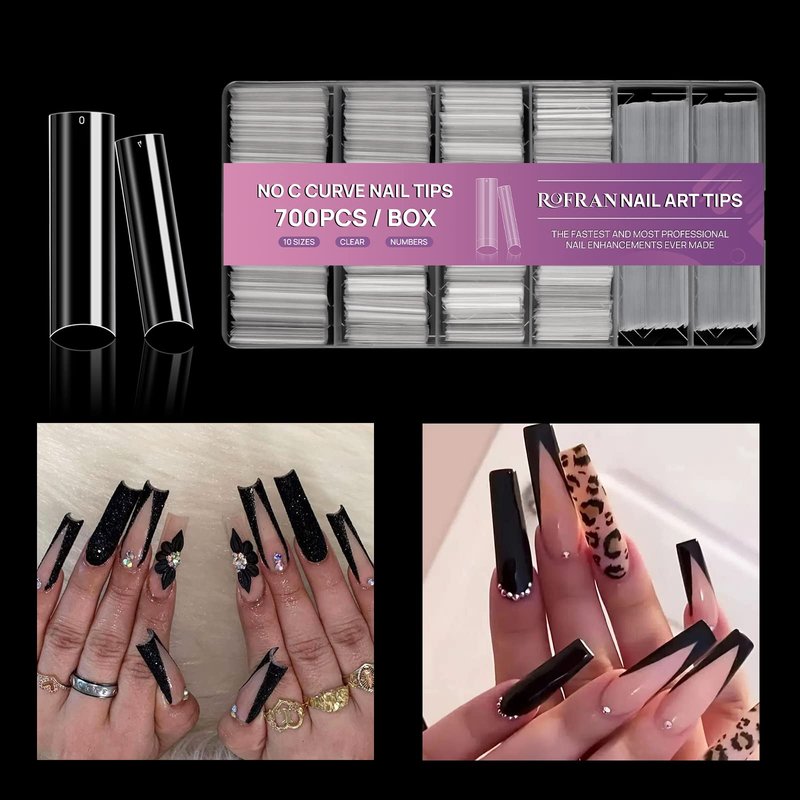 No C Curve Nail Tips Square Nail Tips 700pcs Nails Tips XXL Flat Nail Tips Clear Straight Nail Tips——Come and keep up with the fashion trend of long nails! Here are some steps for using them: 1. Prepare your nails: Before applying the no c curve nail tips, make sure your nails are clean and dry. Sand your nails and trimming the cuticlesuticle areas of your nail. 2. Select your desired no c curve nail tips: The no c curve nail tips come in a variety of sizes and shapes to fit different nail sizes and styles. Choose the tip that best fits your natural nail and aesthetic preferences. 3. Apply glue: Apply a small amount of nail glue to the underside of the no c curve nail tips, taking care not to use too much glue as this can cause the tip to slide around or lift. 4. Place the no c curve nail tips on your natural nail: Press the No c curve nail tips firmly onto your natural nail, starting from the base of your nail and working your way to the tip. Hold the tip in place for a few seconds to ensure it adheres properly. 5. Trim and shape no c curve nail tips: Once the glue has dried, you can shape the no c curve nail tips to your desired length and shape using a nail file or clipper. 6. Apply polish and decorations: Now that your no c curve nail tips are securely in place, you can apply the no c curve nail tips and decorations to create your desired nail art design.