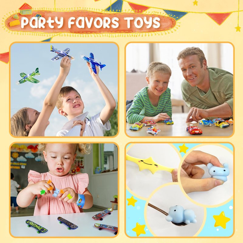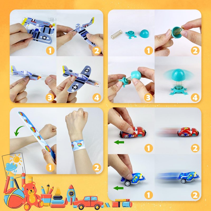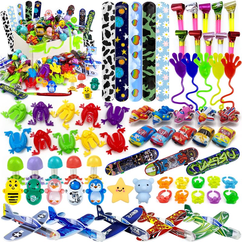 - PACKAGE:You will get 70pcs party favor toys in total:10pcs Jumping Frogs,5pcs Airplanes, 10pcs Blow outs, 5pcs Slap Bracelet, 5pcs Jump up Spring Toys, 10pcs plastic rings,5pcs Pull Back Car, 5pcs Pull Back Plane, 2pcs Mini Toys, 3pcs Finger Skateboards,5pcs Sticky Hands, 5pcs Mini Tumbler Toys.