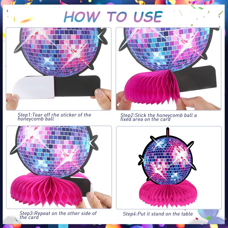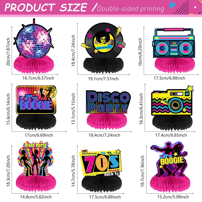 - Package contents: you will get 9 non-repetitive 70s disco party honeycomb centerpieces and 18 pieces of honeycomb balls; The double sided design is made of thick cardboard, which is reliable and reusable
