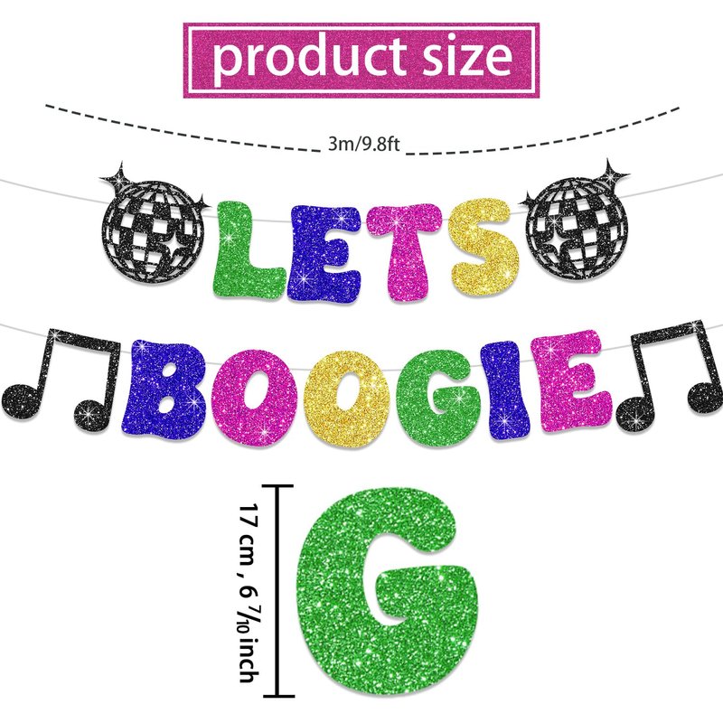 - Places to use: The lets boogie party decorations banner can be hung indoors or outdoors. The disco theme decor hanging swirls can be used on the wall, the tables, and the ceilings. The cutouts and foil swirls are separate and you can use them in different places