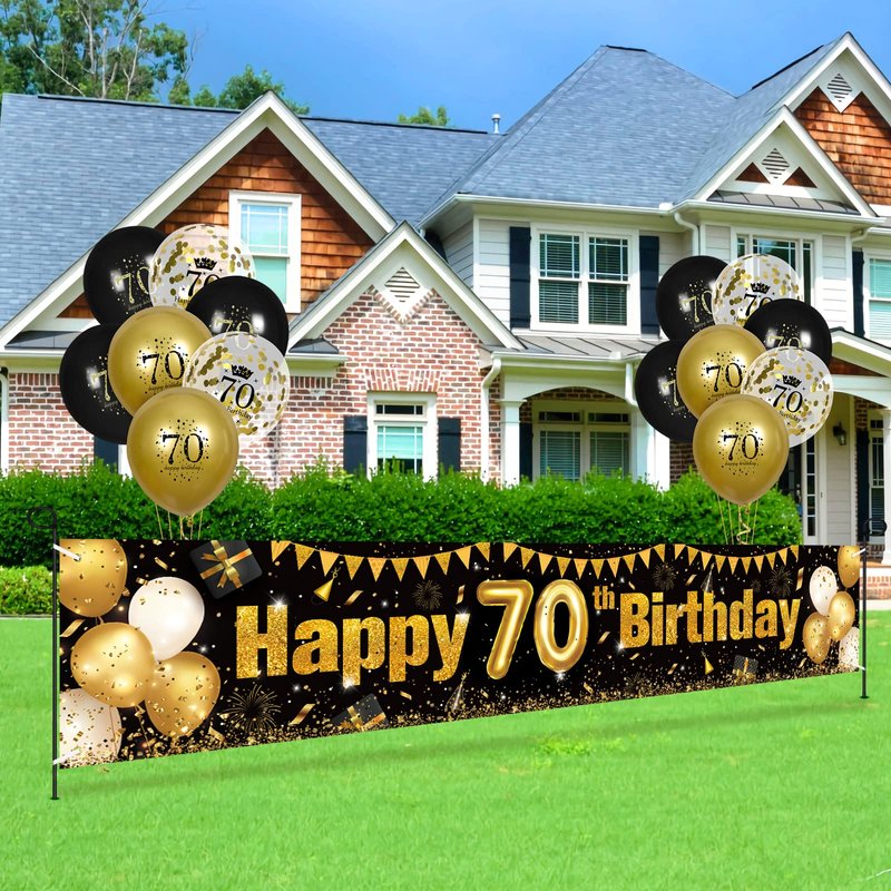 - ✨【BANNER MATERIAL】: The black and gold happy 70th birthday yard banner for men and women is made of durable polyester, lightweight, foldable, and washable. it can be reused for a long time.Printed with "HAPPY 70th BIRTHDAY", combined with 18pcs balloons as party decorations, it adds a great party atmosphere to a birthday party.