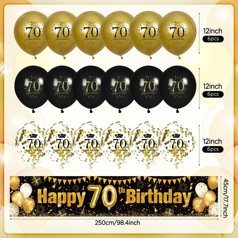 - ✨【70TH BIRTHDAY DECORATIONS】: You will get a black and gold 70th birthday banner, 18 pieces of latex happy birthday balloons with a ''70th Happy Birthday'' pattern (6pcs gold balloons + 6pcs white balloon +6pcs transparent Inflatable Clear Confetti balloons). It would be an impressive decoration for 70th Years Old birthday party 70th anniversary birthday party.