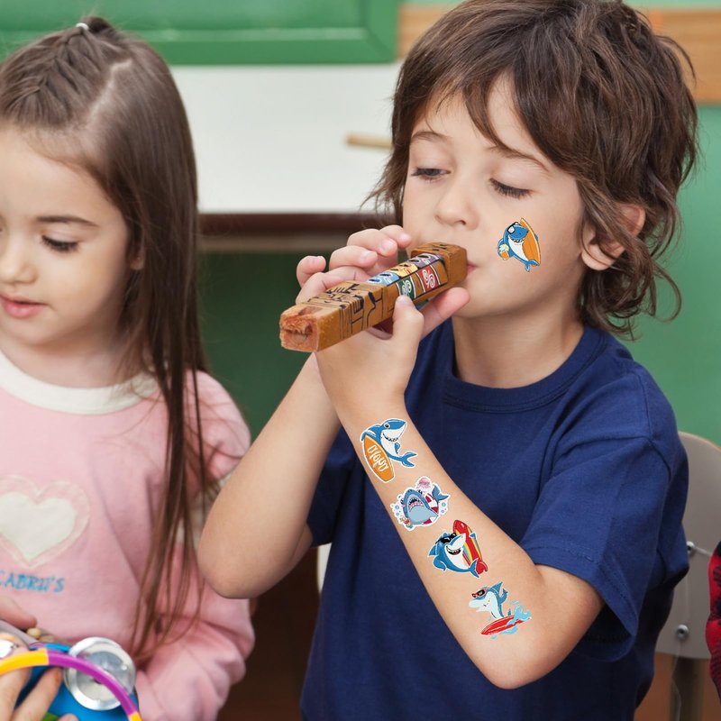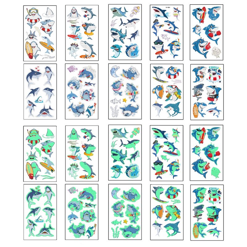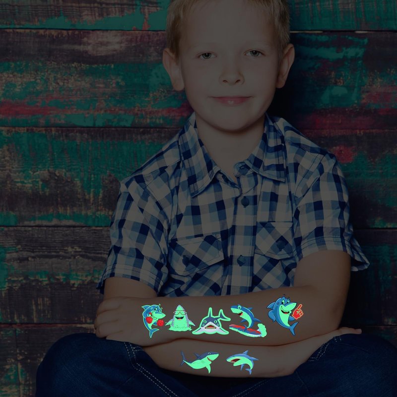 - Luminous Shark Party Supplies: This luminous shark temporary tattoos featuring 10 sheets adorned with a total of 71 exquisite and lively designs. Each sheet measures 4.7 * 2.7 inches, The styles are very rich, and sufficient quantity is enough for your daily use and replacement.