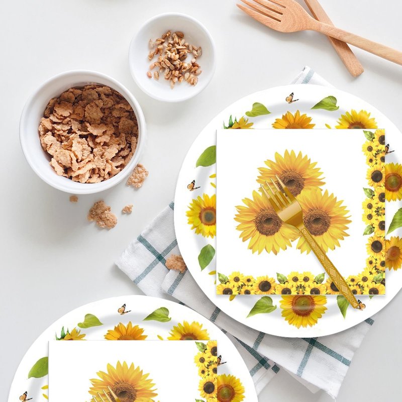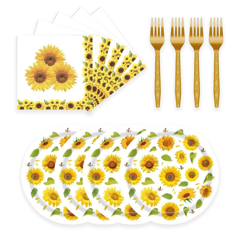 - Sunflower Party Supplies: This party set includes 24 Sunflower paper plates (7''), 20 Sunflower napkins and 24 forks for a party of 24 guests, Perfect for fall sunflower birthday party decorations.