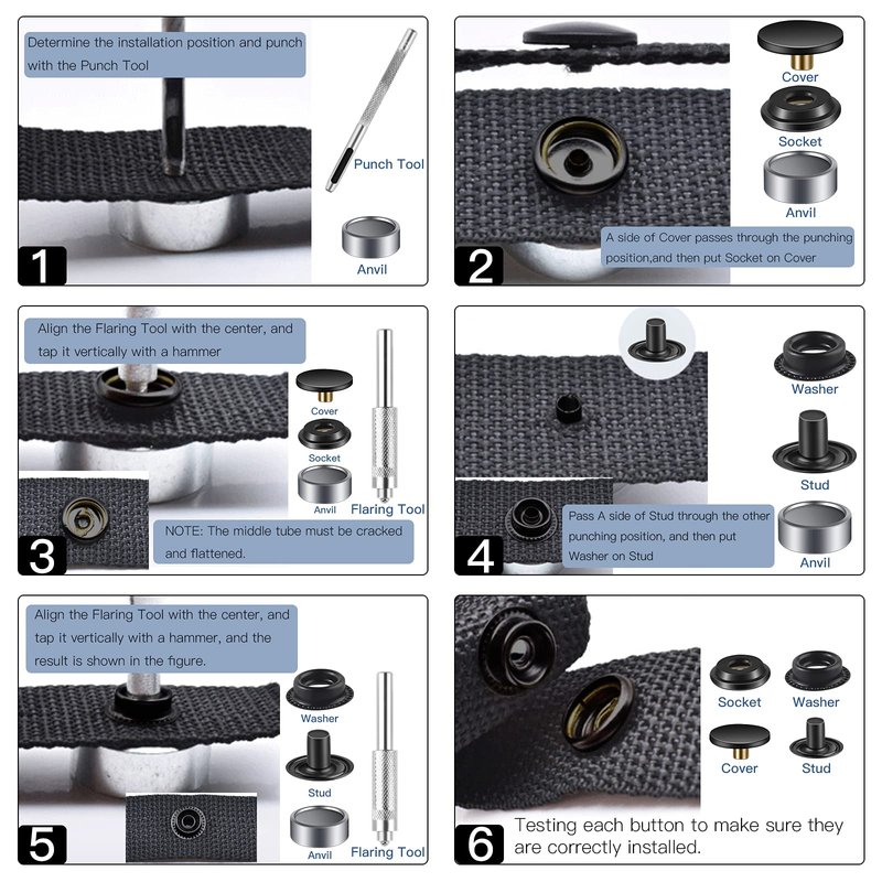 The process of installing these snaps is easy and effortless with the 2 fixing tools. For your convenience, we have included a detailed instruction manual to assemble the pieces successfully.
