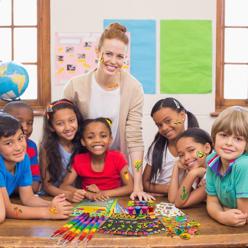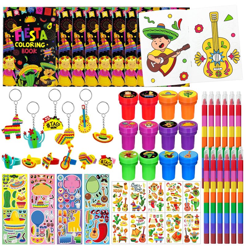 - Mexican Party Favors Set: our Mexican Party Favors set includes 12 coloring books(12 pages per book), 12 rainbow stacking crayons(8 colors),12 tattoos, 12 stampers, 12 DIY Art Craft stickers, 6 rings and 6 keychains, sufficient quantity, and various styles enrich your Mexican Party