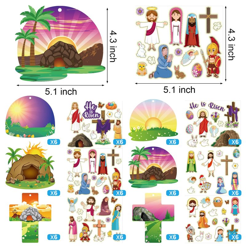 - Easter Craft Set: the package comes with 36 sets of Easter craft kit for kids in 6 styles, each set includes 1 sheet of 4.13 to 5.12 he lives scenes card, 1 sheet of 5.3 x 4.1 inch he lives scenes sticker, enough for your Easter Sunday School activities, which come with ropes for easy hanging and decorating, enough to meet the needs of a religious activity for kids