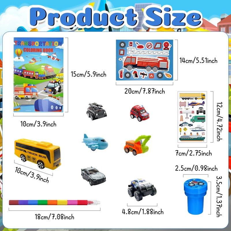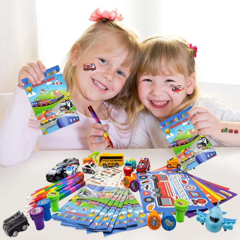 - Size Information: transportation party favors supplies gifts coloring books is about 4X6 inches,tattoo stickers are about 2.68 x 4.72 inches, and 8 different colors stacking crayons is about 7 inches,stampers are about 1 x 1.38 inches,DIY sticker is about 4 inch,transportation car is about 2.5 inch
