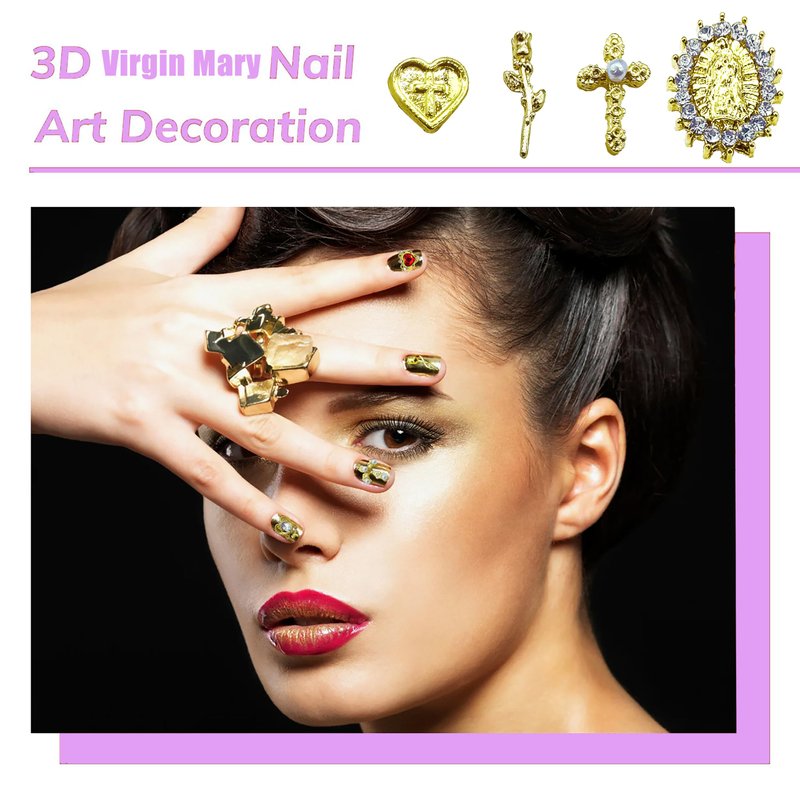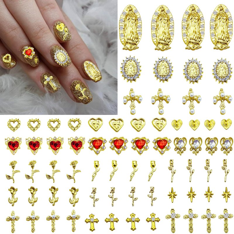 - Nail Art Decoration Set: Our 72-piece gold nail accessories feature exquisite designs, gold gem heart, gold heart shape, gold cross, gold rose and Virgin Mary. Add a touch of luxury and sophistication to your manicure, allowing you to mix and match to create personalized nail designs that reflect your personal style.