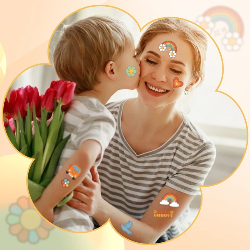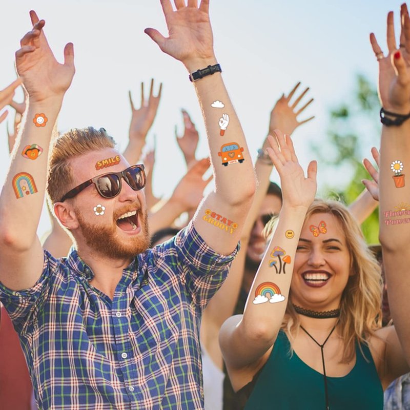 - Hippie Party Decorations: These rainbow tattoos for kids combine with 70s groovy retro hippie theme, involving bright patterns and signs, easy to get kids' attention and their favors, adding more lively and sweet happy atmosphere to the 70s party.