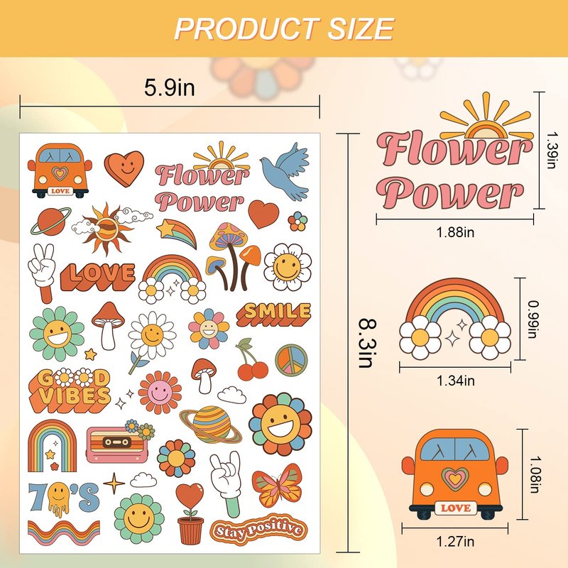- 70s Temporary Tattoos: Package include 2 sheet 75 pieces peace and love tattoos for kids, each sheet measures 5.9" x 8.27" size. These hippie tattoo stickers are cute cartoon designed with Rainbow,Love,Flower Power, Good Vibes, Smile, Stay Groovy.