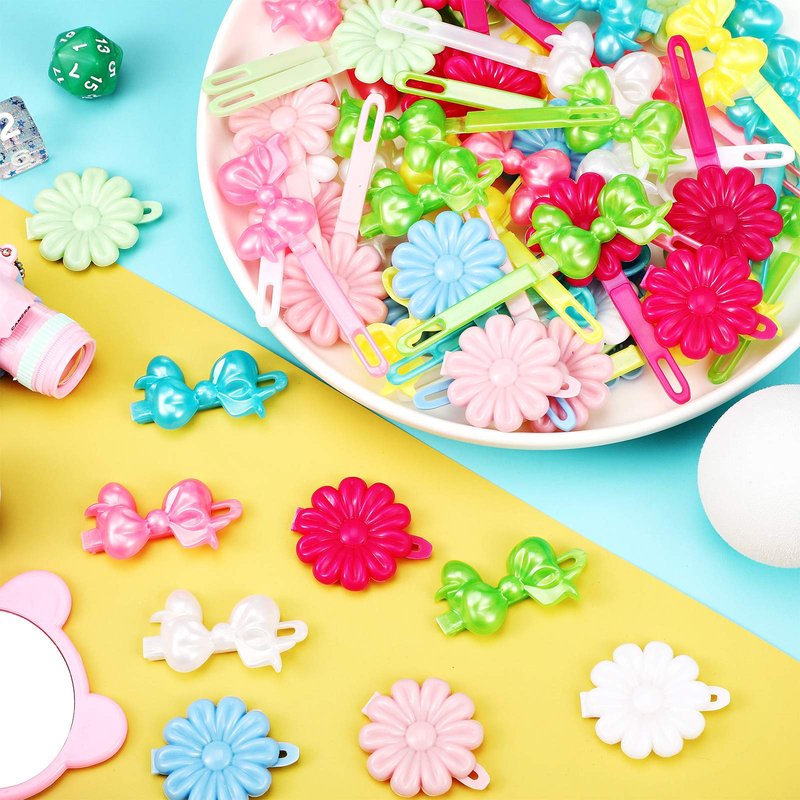 76 Pieces Self Hinge Plastic Hair Barrettes for Girls Multi-coloured Flower and Bowknot Hair Clips Cute Hair Barrettes 80s 90s Hair Clips Cartoon Design Hairpins Hair Accessories (Flower, Bowknot)