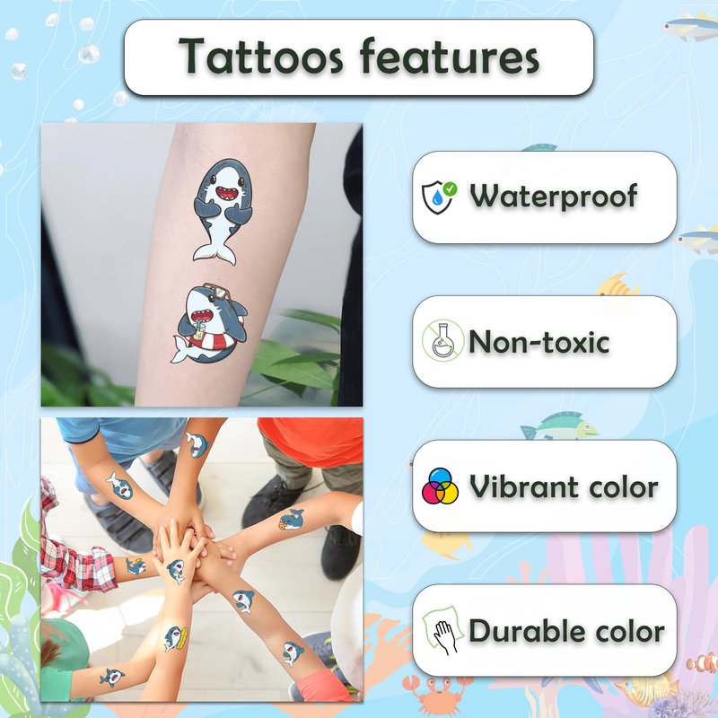 - [Adaptation] Suitable for a range of situations. Shark tattoos offer a fun and economical touch to any event, whether it's a home party or an outdoor festival. They're perfect for party favors or DIY entertainment, and party decorations help create an unforgettable and pleasurable atmosphere.