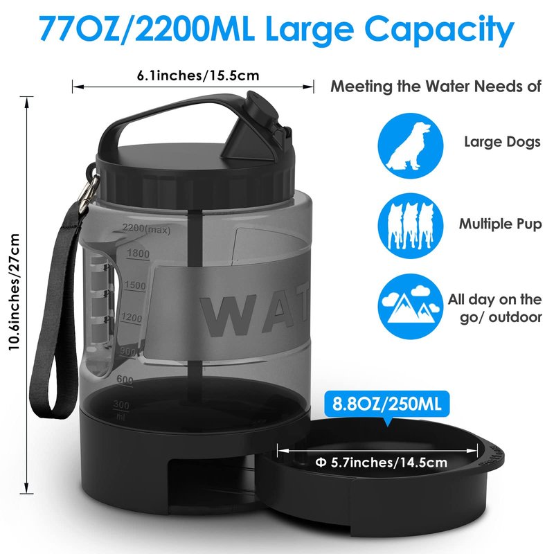 - 💧【77oz Large Dog Water Dispenser】The exclusive customised large capacity portable dog travel water bottle provides your small/medium/large dog with plenty of healthy water. The 77oz large capacity dog water bottle is perfect for camping, hiking, and travelling, ensuring your dog has clean water even when out and about.