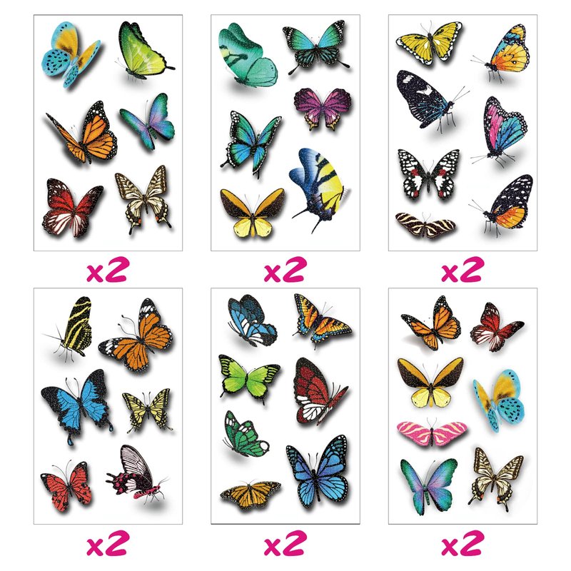A suit including 12 sheets 4.7“x3” Butterflys Glitter styles Temporary Tattoos How to use your temporary tattoo? 1 Decide where you want to apply the tattoo.Make sure your skin clean and dry before application. 2 Cut the tattoo out as close to the edge as possible. 3 Remove the protective transparent sheet and place the design face down onto the desired area. 4 Wet the paper with the wet towel firmly or sponge and wait 30 seconds. 5 Carefully remove the tattoo paper to check if it has transferred,if not press little longer.Be sure not to twist or stretch the skin until the tattoo had time to set. When removing the tattoo, you can use alcohol, baby oil or makeup remover, soak the temporary tattoo for a few minutes, and then gently wipe it until it is removed. Note: It is not suitable for sensitive skin or skin allergic to adhesives. If you feel unwell, please stop using temporary tattoos immediately. prompt: We recommend that you clean the place where you want to stick the tattoo to make it more realistic. If you lightly apply baby powder on the tattoo area with a makeup brush, the temporary tattoo will last longer. Avoid rubbing or scrubbing the tattoo area when taking a bath, otherwise the tattoo will fall off quickly, shortening the use time.