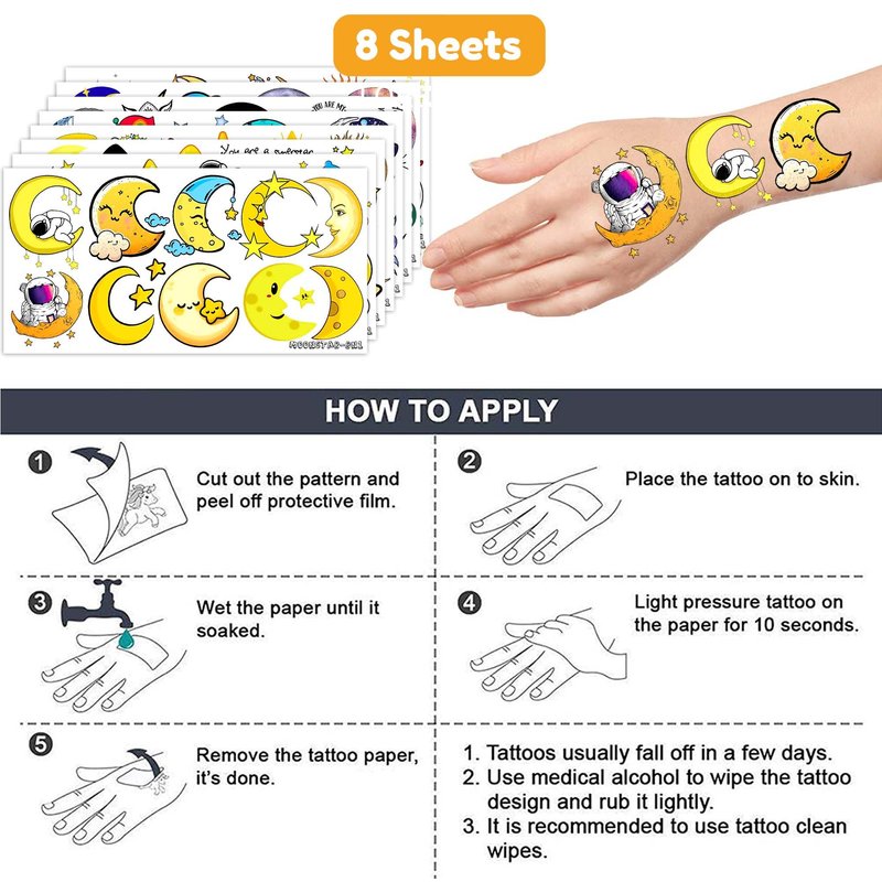 🌓OUTER SPACE MOON TATTOO: Hey there! You'll be receiving an awesome set of 8 sheets with 78 MOON STAR tattoos pieces in 6.1X3.1 inches. Isn't that amazing? You'll have plenty to use daily, replace, or even share with your friends and family. So get ready to show off your unique style and have some fun with these cool tattoos! 🌛SUN MOON STARS PARTY DECORATIONS: Do you ever feel the urge to explore the vast universe and its sparkling stars? Often when you look up at the sky, you yearn to see the stars, but they eventually set, leaving you in darkness. We offer a solution to this - our MOON and STAR tattoos - apply on your skin and let them represent a beautiful constellation visiting you. ♻️SAFE AND HIGH QUALITY: We create temporary tattoos using high-quality, eco-friendly paper that is safe to use. Our tattoos are visually appealing and made with utmost care for our clients' safety. 📌HOW TO APPLY: Firstly,Cut out the pattern and peel off protective film. Secondly, place the tattoo on to skin or objects like a water bottle, purse, laptop,phone case,etc. Next, wet the paper until it soaked.Then, light pressure tattoo on the paper for 10 seconds.Finally, remove the tattoo paper it's done. Go ahead and enjoy your stunning new look! And You'll have a gorgeous, velvety tattoo that can be easily removed with baby oil, soap, or water. 💌THINGS TO NOTES: Do not apply around eyes, lip or sensitive skin area.Under no circumstances should anyone under the age of four use this without adult supervision. Our team is always here to help and make sure you have a positive shopping experience. Please do not hesitate to contact us for assistance.