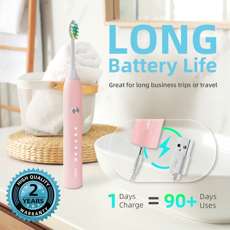 7AM2M Sonic Electric Toothbrush for Adults and Kids, with 6 Brush Heads, 5 Modes with 2 Minutes Build in Smart Timer, Roman Column Handle Design (Pink, 1 Count (Pack of 1))