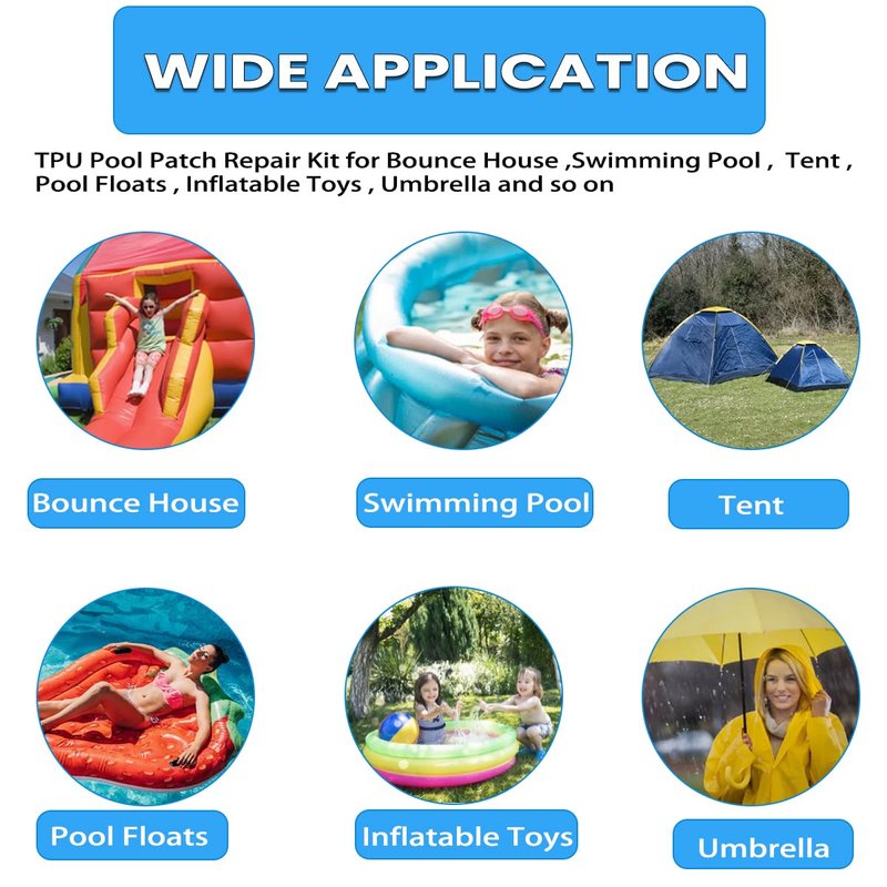 - 【Widely Applications】 This TPU patch repair kit can not only repair various high-value inflatable products, such as air beds, inflatable boat, bounce house, inflatable sofas, swim ring, beach balls, tents, and can also be used to repair or bond variety of materials, including PVC, nylon, artificial leather, rubber, plastic, metal, glass, etc