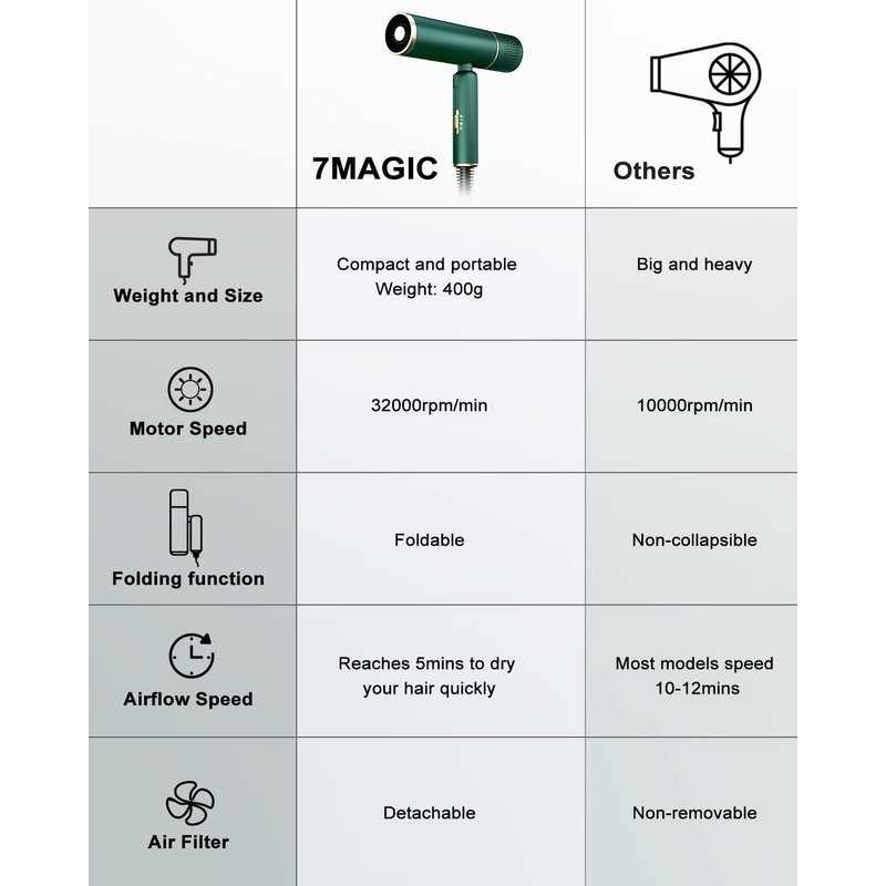 - Blowing Hair Time 30% Faster than Ordinary Hair Dryer - 7MAGIC hair dryer's wind speed is 2 times the other hairdryer; the maximum wind speed is 18m/s; the rotational speed is 32000 RPM. Drying hair is 30% faster than the ordinary hair dryer. It only takes 1-2 minutes for short hair, 3-5 minutes for medium-length hair, and 5-8 minutes for thick and long hair