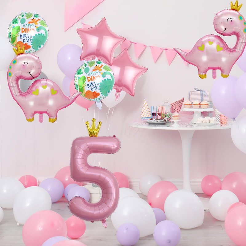 7pcs Pink Crown Dinosaur Balloons, Girl Dinosaur Birthday Number Mylar Foil Balloon Pink Dinosaur 5th Birthday Party Supplies Decorations (5th)