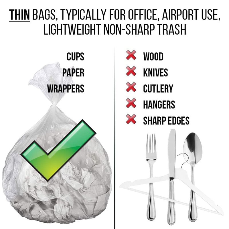 With a 6-micron thickness, this bag is perfect for disposal of paper and other lightweight materials. While this bag is not meant to collect sharp objects, its construction makes it more puncture-resistant.