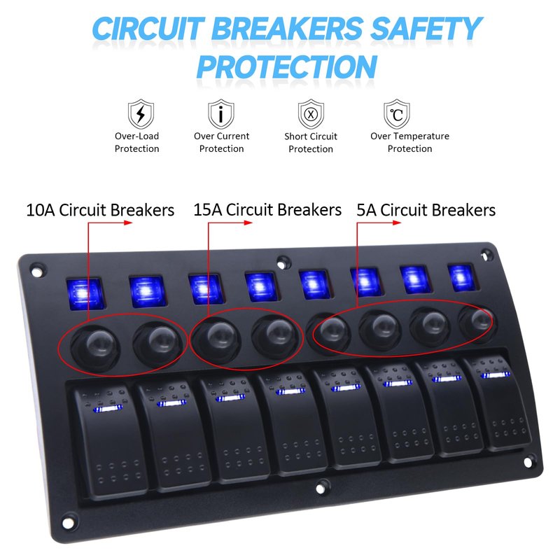 - MULTIFUNCTION ROCKER SWITCH PANEL:Marine switch panel waterproof included 8 on-off blue LED rocker switch, 8 circuit breakers(2 * 10A, 2 * 15A, 4 * 5A), great for all types of circuit control