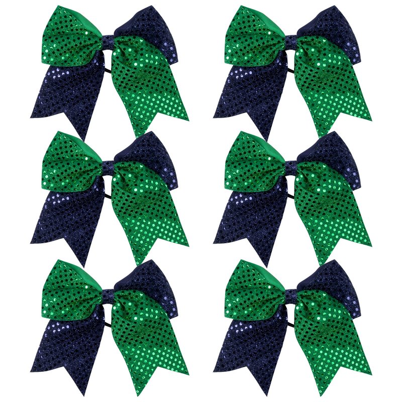 8 Inch 2 Color Cheer Bows Cheerleader Ponytail Holder with Bling Fling Sequin Hair Tie Cheerleading Bows 6 Pcs (Navy Blue/Green)